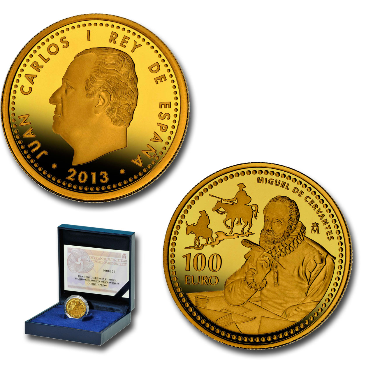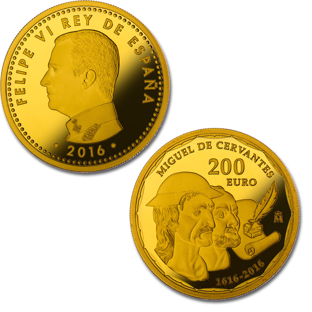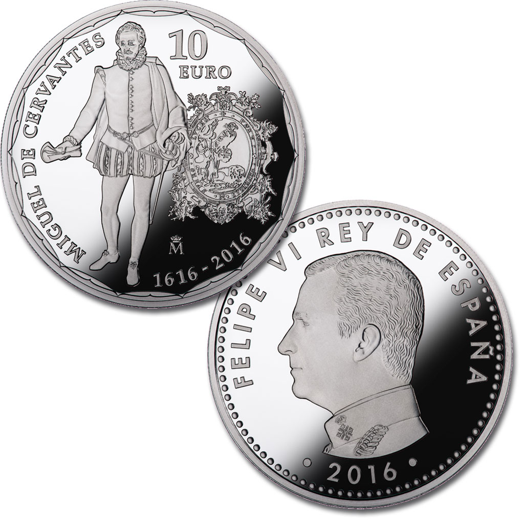 130. a b «Orden ECC/451/2016, de 23 de marzo, por la que se acuerda la emisión, acuñación y puesta en circulación de monedas de colección que conmemoran el «IV Centenario de la Muerte de Miguel de Cervantes 1616-2016».». BOE. 23 de marzo de 2016. Consultado el 15 de junio de 2018.