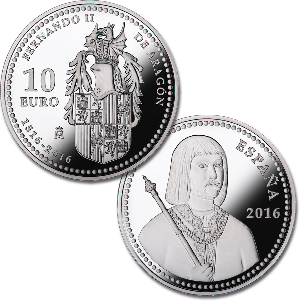 131. a b «Orden ECC/452/2016, de 23 de marzo, por la que se acuerda la emisión, acuñación y puesta en circulación de monedas de colección que conmemoran el «V Centenario de la Muerte de Fernando II de Aragón 1516-2016».». BOE. 23 de marzo de 2016. Consultado el 17 de junio de 2018.