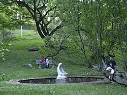 Grupo escultórico en resina epóxica, cuarzo y pizarra con fuente. Pedestal en hierro | |