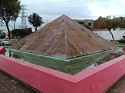 Monumento dedicado a la Revolución Mexicana, inaugurado el 20 de noviembre de 1955; el arquitecto a cargo del monumento fue Vicente Mendiola Quezada, el mismo que realizó la Diana Cazadora.[20][21] Durante la Pandemia de COVID-19 en Hidalgo, se le colocó cubrebocas a las estatuas del monumento.[13][14] Características El Monumento a la Revolución es una pieza de concreto en forma de columna y adornada con seis personajes de la Revolución Mexicana,[20][21] en la parte baja se encuentran las estatuas de Nicolás Flores Rubio, Francisco de Paula Mariel y Felipe Ángeles;[22] y en la parte media Venustiano Carranza, Francisco I. Madero, Emiliano Zapata;[22] y en su parte alta está rematada por un pebetero.[20][21] En la base se encuentran las siguientes frases: "La Revolución Mexicana encarna la justicia social: es la causa del pueblo", "La Revolución Mexicana es la sangre del pueblo y la savia de su tierra", "Para la Revolución la patria es una y en ella caben todos los mexicanos, Adolfo Ruíz Cortines".[20][21] Ubicación Se encuentra ubicado en la Glorieta Revolución, en el cruce de la cruce de la Av. Revolución y la Av. Madero en el centro histórico de la ciudad. Coordenadas | |