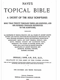 Esta página presenta una lista de cerca de 2.600 nombres propios con sus significados de la Biblia , sobre todo compilado en el siglo diecinueve de los recursos públicos del Diccionario de nombres de la Biblia de Hitchcock como parte del análisis nuevo y completo de la Santa Biblia de Hitchcock, escrito por Roswell Dwight Hitchcock[1][2] y el Diccionario de la Biblia por William R. Smith.[3] La mayoría de los nombres masculinos y femeninos y sus definiciones también se pueden encontrar en los libros de referencia de Herbert Lockyer Todos los Hombres de la Biblia[4] y Todas las mujeres de la Biblia.[5] La mayoría de los nombres divinos y sus definiciones también se pueden encontrar en el libro de Lockyer titulado Todos los Nombres Divinos y los títulos en la Biblia.[6]
