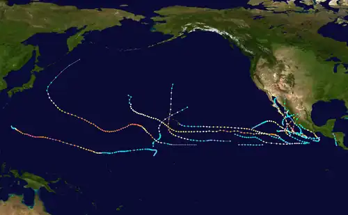 | Paka | 28 de noviembre–23 de diciembre de 1997 | Supertifón categoría 5 | 185 (295) | 920 | Islas Marshall, Islas Marianas | 584 | Ninguno | ||