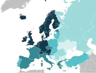 - ↑ Geográficamente, Chipre generalmente es incluido en Asia Occidental o en Oriente Medio, pero cultural e históricamente ha sido considerado un país europeo.