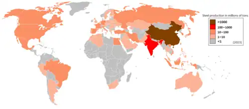 Esta es una lista de países por producción de acero, con base en datos proporcionados por la Asociación Mundial del Acero .[ 3] [ 4] [ 5] [ 6]