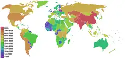 Se han establecido dos rankings, uno de todo el mundo (1.ª columna) y un segundo por continente (2.ª columna), usando las abreviaturas de la figura de la derecha. Los territorios dependiente se sombrean en el mismo color, aunque más pálidos.