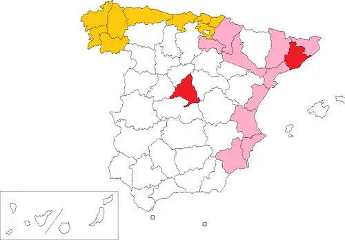 Áreas industriales en España. En rojo, áreas industriales desarrolladas (provincias de Barcelona y Madrid). En naranja, áreas y ejes en declive (eje atlántico: País Vasco, Cantabria, Asturias y Galicia). En rosa, áreas y ejes en expansión (eje del Ebro: Rioja, Navarra, norte de la provincia de Zaragoza y Cataluña; y eje mediterráneo, Cataluña, Comunidad Valenciana y Región de Murcia). El resto son áreas de industrialización inducida y escasa.[1]​ La distribución se asemeja a la de la implantación de la "economía del conocimiento".[2]