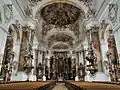 Conservada milagrosamente en el corazón de un valle de los Alpes, la iglesia de Wies (1745-54), obra del arquitecto Dominikus Zimmermann, es una joya del arte rococó bávaro, exuberante, alegre y lleno de color. (UNESCO/BPI)[7]