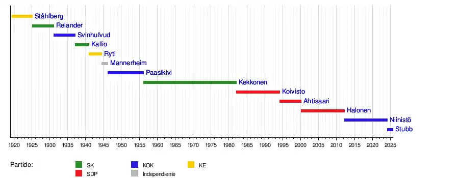 - ↑ «Presidenttien virkaanastujaiset Ståhlbergista Niinistöön». yle.fi (en fi-FI). Consultado el 23 de octubre de 2022.