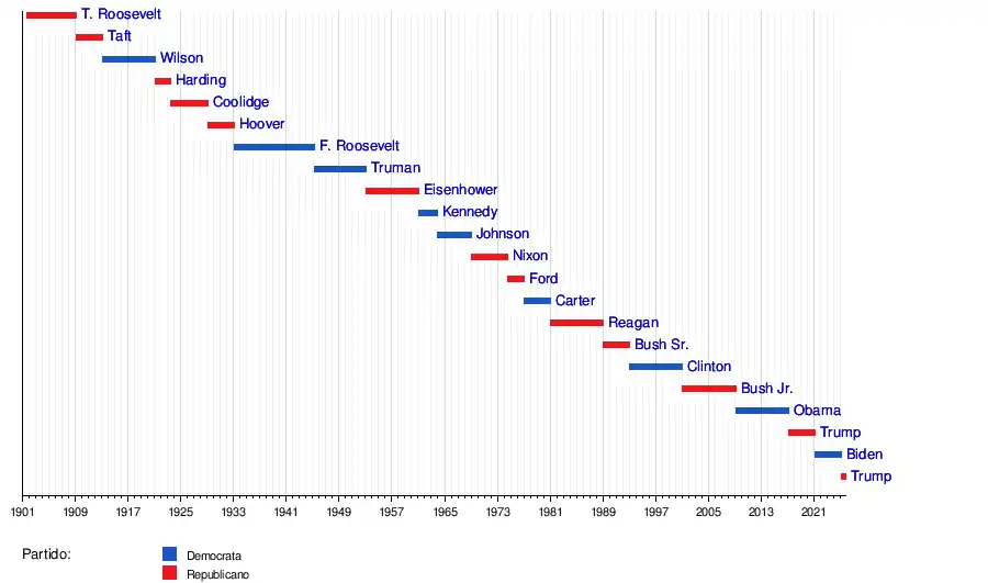 Hubo cuarenta y cinco personas que asumieron el cargo y cuarenta y siete presidencias, debido a que Grover Cleveland y Donald Trump sirvieron en dos mandatos no consecutivos y se les cuenta por orden cronológico tanto como el vigésimo segundo y vigésimo cuarto presidente a Cleveland y cuadragésimo quinto y cuadragésimo séptimo a Trump. De las personas elegidas para el cargo, cuatro murieron durante su mandato por causas naturales, una dimitió y cuatro fueron asesinadas.