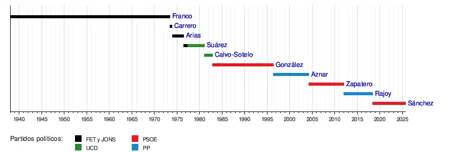 José María Aznar (PP) | 5 de mayo de 1996[27] | 13 de marzo de 2000[28] | 7 años, 11 meses y 12 días | ||