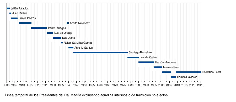 Desde el primer presidente oficial del club, Juan Padrós, en 1902, han pasado por el máximo cargo de la entidad un total de 19 presidentes, incluyendo los segundos mandatos de Adolfo Meléndez y Florentino Pérez; sumando a Julián Palacios, que figura en los estatutos como primer presidente entre los años 1900-02,[1] fecha de origen del club sin formalizar los trámites administrativos correspondientes.[2] Nacido del club embrionario o protoclub de la Sociedad de Foot-Ball, fue él el quien le dio vida.[3]