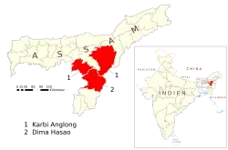 Karbi Anglong es uno de los 35 distritos de Assam, conocido anteriormente como Mikir Hills. Formaba parte de las áreas excluidas y las áreas parcialmente excluidas (el actual noreste de India) en la India británica. El gobierno de la India británica nunca había incluido esta área bajo la jurisdicción de su gobierno. Por lo tanto, no se realizó ningún trabajo o actividad de desarrollo del gobierno, ni se recaudó ningún impuesto de las colinas, incluida Karbi Anglong. El primer memorando para una patria karbi fue presentado al gobernador Reid el 28 de octubre de 1940 por Semsonsing Ingti y Khorsing Terang en Mohongdijua.[26] Los líderes karbi eran entonces parte de la Conferencia de Líderes de All Party Hill (APHLC) que se formó el 6 de julio de 1960. El movimiento volvió a cobrar impulso cuando el Consejo del Distrito de Karbi Anglong aprobó una resolución exigiendo un estado separado en 1981. Luego, nuevamente desde 1986 a través del liderazgo del Comité de Demanda del Estado Autónomo (ASDC), exigió la condición de estado autónomo de Karbi Anglong y Dima Hasao en virtud del artículo 244 (A). En 2002, el Consejo Autónomo de Karbi Anglong aprobó otra resolución para presionar por la exigencia de la estadidad. Varias organizaciones presentaron otros memorandos en diferentes momentos. La demanda de un estado separado se tornó violenta el 31 de julio de 2013 cuando manifestantes estudiantiles incendiaron edificios gubernamentales. Tras el incidente, los líderes electos de Karbi Anglong presentaron conjuntamente un memorando al primer ministro de la India exigiendo un estado separado.