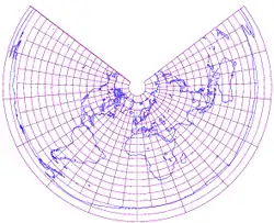 Basado en primera proyección de Claudio Ptolomeo | Cónica | Equidistante | Las distancias a lo largo de los meridianos se conservan, ya que es la distancia a lo largo de uno o dos paralelos estándar.[1] |
