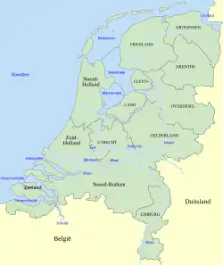 Todas las aguas del país drenan en el mar del Norte, aunque en parte lo hacen a través del lago IJsselmeer. La lista ordena los ríos principales según sus desembocaduras en la costa, empezando en la frontera belga de Knokke y terminando en la frontera alemana de Emden. Los afluentes aparecen subordinados a los ríos donde desembocan, ordenados por la proximidad de sus desembocaduras al mar.