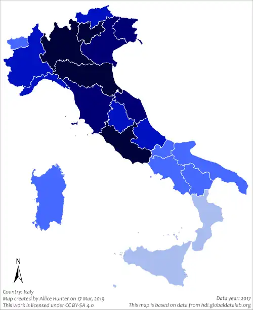 Clasificación de los regiones de Italia por índice de desarrollo humano (datos del 2021).[1]