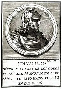 Atanarico fue considerado por los visigodos como su rey fundador,[3] sin embargo, Atanarico fue un juez de los tervingios en la Gutthiuda en una época anterior a la formación de los visigodos tras la Guerra Gótica (376–382) por grupos tervingios, greutungos y otros no godos.[4][5]