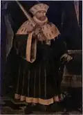 Rama Albertina: Electores de Sajonia En 1547, después de que las tropas del emperador Carlos V vencieran en la batalla de Mühlberg, el elector de la rama ernestina, Juan Federico I, traspasó Wittenberg y la dignidad electoral a la rama albertina por la Capitulación de Wittenberg. | |