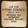 AQUÍ VIVIÓ ANTONIO FERNÁNDEZ NACIDO 1917 DEPORTADO 1941 MAUTHAUSEN ASESINADO 19.9.1941 GUSEN |