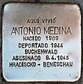 AQUÍ VIVIÓ ANTONIO MEDINA NACIDO 1909 DEPORTADO 1944 BUCHENWALD ASESINADO 9.4.1944 HRADISCHKO-BENESCHAU |