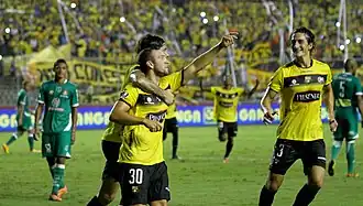 ![]() Celebración de los jugadores en la goleada 6-0 en la que Barcelona se impuso a Mushuc Runa. | |||||