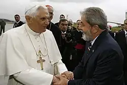 - Brasil: el 9 de mayo de 2007 el papa Benedicto XVI inició una viaje apostólico de cinco días, la primera a América Latina, con motivo de la celebración de la V Conferencia General del Episcopado Latinoamericano y del Caribe en el santuario mariano de Aparecida, a 169 km de São Paulo. El día 11 de mayo de 2007, ante poco más de un millón de católicos Benedicto XVI canonizó al religioso Antonio de Santa Ana, más conocido como Fray Galvão, que se convertía así en el primer santo nacido en Brasil. La ceremonia fue oficiada en portugués, idioma que el sumo Pontífice utilizó desde el primer momento en que pisó tierra brasileña. El domingo, en su último día de visita a Brasil, el Papa presidió la Santa Misa que inauguró la V Conferencia General del Consejo Episcopal Latinoamericano y del Caribe, y predicó la homilía donde lanzó un llamado a la jerarquía católica del mundo, para alejar a la iglesia de la política. El Papa refirió a Latinoamérica como el continente de la esperanza, y señaló que la fe, no es una ideología política, ni un movimiento social, ni un sistema económico. Así mismo el máximo líder de la Iglesia Católica expresó su preocupación por los autoritarismos que han resurgido en Latinoamérica y pronunció un fuerte discurso en los que condenó la corrupción de los políticos, el egoísmo de los empresarios y la ironía de los medios de comunicación al referirse a la virginidad e inclusive los desvíos sexuales dentro de la Iglesia católica. La celebración se realizó frente a un millón y medio de fieles aproximadamente. La visita del obispo de Roma a Latinoamérica se da en un momento difícil para el catolicismo en el mundo, que enfrenta situaciones como la despenalización del aborto en la Ciudad de México y el caso mismo de Brasil, donde el gobierno del Presidente Luiz Inácio Lula da Silva pretende la despenalización parcial del aborto.[7]