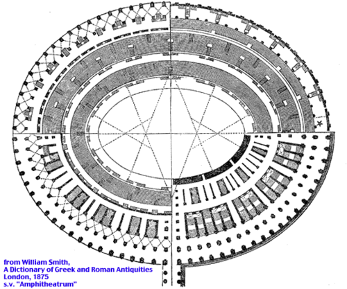 El ejemplar más grande y más elaborado de estas construcciones es el Coliseo. Iniciado en 71 o 72 gracias a la iniciativa de Vespasiano, fue inaugurado sobre el mandato del emperador romano Tito. Por cien días ocurrieron espectáculos durante los cuales se asesinaron a 5 mil bestias salvajes. La construcción fue terminada con Domiciano después de doce años de trabajo continuo. Su arena de 79,35 × 47,20 constaba de una cávea de 187,75 × 155,60 m. Con cincuenta y seis filas, divisadas por clases sociales, cabían alrededor de 55 000 personas. Los primeros asientos que se recibieron eran móviles; los últimos construidos en madera, se encontraban debajo de un pórtico. La fachada exterior travertin se componía de tres niveles de ochenta figuras que seguían los órdenes dórico-toscano, jónico y corintio. Un ático con columnas corintias coronaban la construcción, atravesado por ventanas y decorado con varios escudos. En su último estado, el sótano de la arena estaba completamente unido por un corredor subterráneo a la gran parte donde se encontraban los gladiadores que estaba a proximidad del anfiteatro. El edificio sirvió como modelo de numerosos anfiteatros construidos en el Imperio Romano.