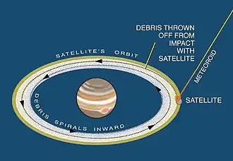 - ↑ a b c d e f g h Burns, J. A.; Showalter, M. R.; Hamilton, D. P.; et al. (1999). «The Formation of Jupiter's Faint Rings» (pdf). Science (en inglés) 284: 1146-1150. PMID 10325220. doi:10.1126/science.284.5417.1146.
