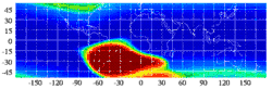 - La anomalía del Atlántico Sur como una mancha roja en la parte derecha de las imágenes.