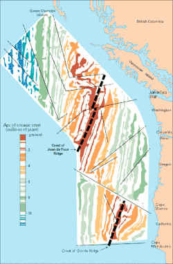 Los estudios magnéticos sobre los océanos han revelado un patrón característico de anomalías en torno a las dorsales oceánicas. Se trata de una serie de anomalías positivas y negativas en la intensidad del campo magnético, que forman franjas paralelas a cada dorsal. A menudo son simétricas con respecto al eje de la dorsal. Las franjas suelen tener decenas de kilómetros de ancho y las anomalías son de unos cientos de nanoteslas. La fuente de estas anomalías es principalmente la magnetización permanente transportada por los minerales de titanomagnetita del basalto y los gabros. Se magnetizan cuando se forma la corteza oceánica en la dorsal. A medida que el magma asciende a la superficie y se enfría, la roca adquiere una magnetización termoremanente en la dirección del campo. A continuación, el movimiento de las placas tectónicas aleja la roca de la dorsal. Cada cientos de miles de años, la dirección del campo magnético se invierte. Así pues, el patrón de rayas es un fenómeno global y puede utilizarse para calcular la velocidad de propagación del fondo marino.[16][17]