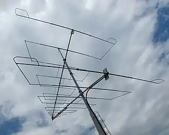 alta potencia[15] porque su amplio ancho de banda permite que una sola antena transmita en frecuencias en múltiples bandas de onda corta. Se ha utilizado el diseño en zig-zag logarítmico periódico con hasta 16 secciones. Estas grandes antenas suelen diseñarse para cubrir de 6 a 26 MHz, pero se han construido aún más grandes que operan hasta 2 MHz. Las potencias nominales están disponibles hasta 500 kW. En lugar de que los elementos se conecten en paralelo a una línea de transmisión central, los elementos se conectan en serie, con los elementos adyacentes conectados en los bordes exteriores. La antena que se muestra aquí tendría aproximadamente 14 dBi de ganancia. Un arreglo de antenas que consta de dos antenas de este tipo, una encima de la otra y alimentadas en fase, tiene una ganancia de hasta 17 dBi. Al ser log periódica, las características principales de la antena (patrón de radiación, ganancia, impedancia de punto de excitación) son casi constantes en todo su rango de frecuencia, con una correspondencia a una línea de alimentación de 300 Ω que logra una relación de onda estacionaria mejor que 2:1 en ese rango.