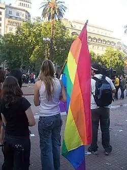 La Iglesia también recibe ataques de algunos grupos feministas. En 2003 durante el XVIII Encuentro Nacional de Mujeres, en la ciudad de Rosario miles de feministas se concentraron en la Plaza de la Bandera de Rosario y provocaron daños a los edificios del Arzobispado, la Catedral y otras iglesias de la ciudad, llenándolos de basura y pintando insultos tales como "¡Saquen sus rosarios de nuestros ovarios!", "Iglesia, basura, vos sos la dictadura", y "Ella (la Virgen María) abortó".[90][91][92] En el Encuentro Nacional de Mujeres que se realizó en la ciudad de Paraná en 2010, se repitieron los actos de violencia contra las activistas católicas, con insultos y golpes.[93] En 2016, durante el XXXI Encuentro Nacional de Mujeres en la ciudad de Rosario, grupos feministas intentaron quemar la catedral.[94][95]