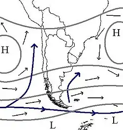 El anticiclón del Atlántico Sur, también conocido con el nombre de anticiclón de Santa Elena, designa una zona subtropical situada en el océano Atlántico meridional, en torno a las coordenadas 25°S 15°O / -25, -15, donde por lo general se encuentra una amplia zona de alta presión atmosférica o anticiclón.[1][2] Esto no quiere decir que la posición y la intensidad de este anticiclón sean permanentes, sino más bien que generalmente se encuentra un anticiclón en las cartas meteorológicas que describen la presión media mensual en dicha zona. Sus nombres se deben a su ubicación en el océano Atlántico y a la isla de Santa Elena, única tierra en esas latitudes.[3]