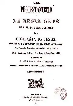 El Frayle de la Compañía de Jesús Juan Perrone, en 1856 publicó El Protestantismo y la Fe donde declaraba que el protestantismo había llegado a su cúlmine estado existente y que pronto decaería condición que, esfuerzo que se hiciere, era inevitable.[2]