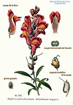 - ↑ Dole J M, H F Wilkins (2005) Antirrhinum. In: Floriculture Principles and Species. D Yarnell, K Yehle, L Dalberg eds). Pearson Prentice Hall. New Jersey, USA. pp:284-294
