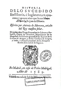 - Historia de María Estuardo, cuyo título completo es Historia de lo sucedido en Escocia, è Inglaterra, en quarenta y quatro años que biuio Maria Estuarda, Reyna de Escocia, escrita por Antonio de Herrera..., está dedicada a la vida y obra de la reina María I de Escocia. Fue publicada en Madrid en 1589 y al año siguiente se editó en Lisboa bajo el mismo título. Posteriormente, en el año 1859 se volvió a reeditar en Madrid, como rareza bibliográfica.[5]