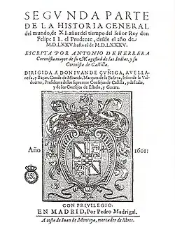 - ↑ Pérez Pimentel, Rodolfo (1988). «Antonio de Herrera y Tordesillas». Diccionario Biográfico de Ecuador. Guayaquil: Universidad de Guayaquil. Archivado desde el original el 24 de octubre de 2008. Consultado el 20 de octubre de 2008.