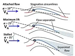Las fuerzas aerodinámicas sobre las velas dependen de la velocidad y dirección del viento y de la velocidad y dirección de la embarcación. La dirección en la que viaja la embarcación con respecto al "viento real" (la dirección y la velocidad del viento sobre la superficie) se denomina "punta de vela". La velocidad de la embarcación en un punto dado de la vela contribuye al viento aparente (VA)—la velocidad y dirección del viento medidas en la embarcación en movimiento. El viento aparente en la vela crea una fuerza aerodinámica total, que puede descomponerse en "arrastre".—el componente de la fuerza en la dirección del viento aparente—y el "levantamiento"—la componente de fuerza normal (90°) al viento aparente. Dependiendo de la alineación de la vela con el viento aparente, la sustentación o la resistencia pueden ser el componente propulsor predominante. La fuerza aerodinámica total también se resuelve en una fuerza impulsora propulsora hacia adelante, resistida por el medio a través o sobre el cual pasa la nave (por ejemplo, a través del agua, aire o sobre hielo, arena) y una fuerza lateral, resistida por las láminas submarinas, patines de hielo o ruedas de la embarcación de vela.[4]
