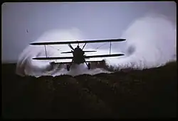 El primer uso conocido de una máquina aérea para dispersar productos químicos ocurrió el 3 de agosto de 1921,[2] bajo la supervisión del Departamento de Agricultura de los Estados Unidos y la estación de investigación del Cuerpo de Señales del Ejército, en el campo McCook en Dayton, Ohio. Bajo la dirección del ingeniero de McCook Étienne Dormoy, un avión Curtiss JN4 Jenny pilotado por John A. Macready fue modificado en el campo McCook para extender arseniato de plomo para matar las orugas de la "esfinge de la catalpa" Ceratomia catalpae, en una granja cerca de Troy, Ohio.[3] La primera prueba se consideró altamente exitosa. Las primeras operaciones comerciales comenzaron en 1924, en Macon, Georgia,[4] por la empresa Huff-Daland Crop Dusting, cofundada por el piloto de pruebas del campo McCook, teniente Harold R. Harris. El uso de insecticidas y fungicidas para la fumigación de cultivos se extendió lentamente en las Américas y, en menor medida, en otras naciones en la década de 1930. El nombre "empolvado de cultivos" (crop dusting en inglés) se originó aquí, ya que de hecho se extendió polvo por los cultivos. En la actualidad, las fumigaciones aéreas utilizan productos líquidos.
