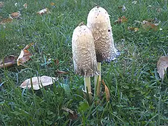 ![]() Ejemplares de "Shaggy Ink Caps" (Coprinus comatus) setas habituales de los bosques de Illinois. | ||