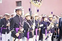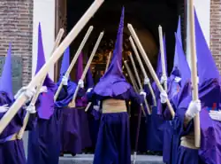Túnica : sarga morada con ancha faja de esparto. Antifaz: raso morado con cruz trinitaria y capirote de 90 centímetros. Alpargatas: negras de esparto acompañadas de medias de color negro. Guantes: blancos de algodón. Medalla: redonda de doble cara con cordón morado e imagen en relieve del Señor y la Virgen. | |