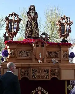 Viste túnica de terciopelo bordada en oro por las Religiosas Adoratrices de Ciudad Real en 1960. En el 2005 se confeccionó otra túnica de terciopelo morada sin bordados. Además de la corona de espinas de plata sobredorada tiene otra para la cuaresma, y dos juegos de cordones de oro con dos escapularios- Va sobre canastilla estilo levantino en pan de oro.