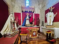 - María Santísima Madre de Dios del Rosario: se trata de una imagen de vestir de la Virgen con el Niño realizada en madera de cedro por Sergio Torres Romero en 2009.[22] La imagen luce un manto en terciopelo granate bordado en cordonería, canutillo y lentejuelas de oro adornado con pedrería de cristales tallados blancos y rojos, realizado por Manuel García Bellido. La orla del manto contiene medallones con imágenes de sibilas y profetas, tomados de las pinturas de Miguel Ángel en la Capilla Sixtina, y el centro de la espalda contiene la escena de la Virgen entregando un rosario a Santo Domingo, cuadro de Luca Giordano conservado en el museo nacional Capodimonte de Nápoles.[23]