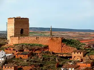- Castillo de Arcos de Jalón. Fechado en el siglo XIV, se levanta sobre la antigua fortaleza árabe. Ya en el siglo XIV el castillo fue sitiado por los partidarios del rey castellano Pedro I el Cruel, que lucharon contra el rebelde Fernán Gómez de Albornoz, partidario de su hermano bastardo Enrique de Trastámara. Precisamente el primer propietario conocido fue Fernán Gómez Albornoz, cuyos escudos aparecen en la puerta de acceso a la torre del homenaje, aunque se sabe que pasó por distintas manos, como Juan Duque o las familias de los Manrique o los Medinaceli, que lo poseyeron hasta principios del siglo XIX. Figura en el catálogo de Bienes Protegidos de la Junta de Castilla y León en la categoría de Castillo con fecha de declaración 22 de abril de 1949.[11]