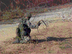 - Instrumento de forma parecida al usado en la marina, compuesto de varios ganchos de hierro con un mango donde se enchufaba un asta de madera. Su principal uso era el arrojarlo desde la muralla para enganchar a los soldados asaltantes, bien lanzándolo a mano o mediante la máquina de guerra llamada cigüeña. Un arpeo compuesto de tres o cuatro garfios de hierro al extremo de un largo mango de madera se usa para acercar a la orilla o juntar unos a otros los cuerpos flotantes que forman los puentes militares.[2]