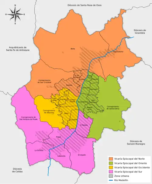 En 2021 en la arquidiócesis existían 342 parroquias (entre ellas doce cuasiparroquias y un templo no parroquial: la iglesia de San Juan de Dios en Medellín)[20] que son atendidos por 1062 sacerdotes. Además, el arzobispado es prácticamente urbano, pues el 97 % de la población de su jurisdicción vive en las áreas urbanas.[21] agrupadas en veintiún arciprestazgos, estos en ocho zonas pastorales (hoy informales, pero se siguen utilizando), que a su vez se agrupan en cuatro vicarías episcopales de zona:[22] En el 2011 se reorganizó territorialmente la arquidiócesis, las antiguas ocho zonas pastorales establecidas durante la administración episcopal de Botero Salazar, fueron reemplazadas por las cuatro vicarías episcopales de zona, pero se conservaron intactas las vicarías foráneas.[23]