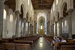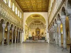 En Rávena, la basílica de planta central de San Vital (San Vitale), construida en el siglo VI,[2] y la basílica de San Apolinar Nuovo, construida a principios del siglo VI por Teodorico el Grande, son dos de los ejemplos mejor conservados y armoniosos de planta basílica tradicional. En Constantinopla, además de la basílica de la Santa Sabiduría (Santa Sofía), se construyeron en el reinado de Justiniano la de Santa Irene, cerca de la de los Santos Sergio y Baco (también llamada «pequeña Hagia Sophia»), construida entre 527 y 536[Ma. 6] y que se dice que sirvió de modelo de las dos primeras, porque en ella también hay una combinación de características distintivas de las iglesias longitudinales y centralizadas.[N 1]