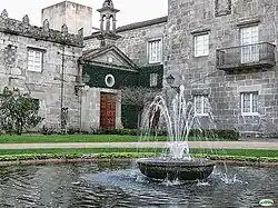 - Pazo de Montecelo.[40] Cercano a la avenida de García Barbón, en pleno casco urbano del municipio, también es conocido como Casa Durán, se trata de un pazo que data del año 1850 y que posteriormente fue rehabilitado por la familia Durán. El edificio construido en perpiaño granítico está catalogado como Bien de Interés Cultural, consta de dos alturas y en su lateral se encuentra una torre almenada, mientras que en la parte baja hay un corredor asoportado bajo arcos de medio punto, que dan lugar a una balconada en su parte superior, la cual cuenta con balaustradas de piedra.[41] La combinación de estos elementos constructivos hacen que el Pazo de Montecelo sea un ejemplo arquitectónico de combinación de estilo barroco y medieval.[42] Actualmente el pazo es sede de un bufete de abogados, siendo esta misma empresa la que recientemente contrató las últimas obras de remodelación del inmueble.