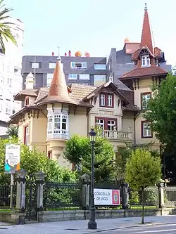 - Edificio el Pilar. Antigua vivienda unifamiliar de estilo modernista y neomedievalista, actualmente es propiedad del Ayuntamiento de Vigo. El edificio del año 1913 fue proyectado por José Franco Montes, para su diseño se inspiró en los cottages centroeuropeos,[60] apreciándose la influencia de este estilo arquitectónico principalmente en sus dos torres terminadas en pico, así como también en la existencia de cubiertas con gran inclinación. En su decoración interior predominan los elementos en madera, como es el caso del artesonado y en sus escaleras.