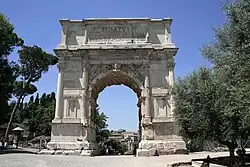 Un arco de triunfo es una estructura monumental en forma de arco con uno o más pasadizos arqueados, a menudo diseñados para atravesar una calle o vía. Los orígenes del arco triunfal romano no están claros. Había precursores del arco triunfal en el mundo romano; en Italia, los etruscos usaban arcos elaboradamente decorados como puertas o portales para sus ciudades. Los ejemplos sobrevivientes de arcos etruscos todavía se pueden ver en Perugia y Volterra. Los dos elementos clave del arco de triunfo, un arco redondeado y un entablamento cuadrado, se habían utilizado durante mucho tiempo como elementos arquitectónicos separados en la antigua Grecia.