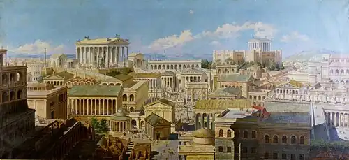Bajo el gobierno de Augusto se amplió el cauce del río Tíber para evitar inundaciones y se construyeron nuevos acueductos, además de las primeras termas públicas, dos teatros, un anfiteatro y una biblioteca pública; también se construyó un nuevo foro, el Forum Augusti (Foro de Augusto), el Ara Pacis (Altar de la Paz), templos como el Panteón de Agripa o el de Mars Ultor (Marte Vengador), jardines, pórticos y otros edificios públicos. Otra de las obras más importantes del programa de embellecimiento urbano de Augusto fue la renovación del Campus Martius (Campo de Marte), que quedó transformado en un impresionante complejo monumental. El Mausoleo de Augusto estuvo destinado a guardar sus restos y los de su familia, y la Casa de Augusto (Domus Augusti) en el monte Palatino sería el primer edificio del complejo que constituiría el palatium, el palacio imperial.[7]